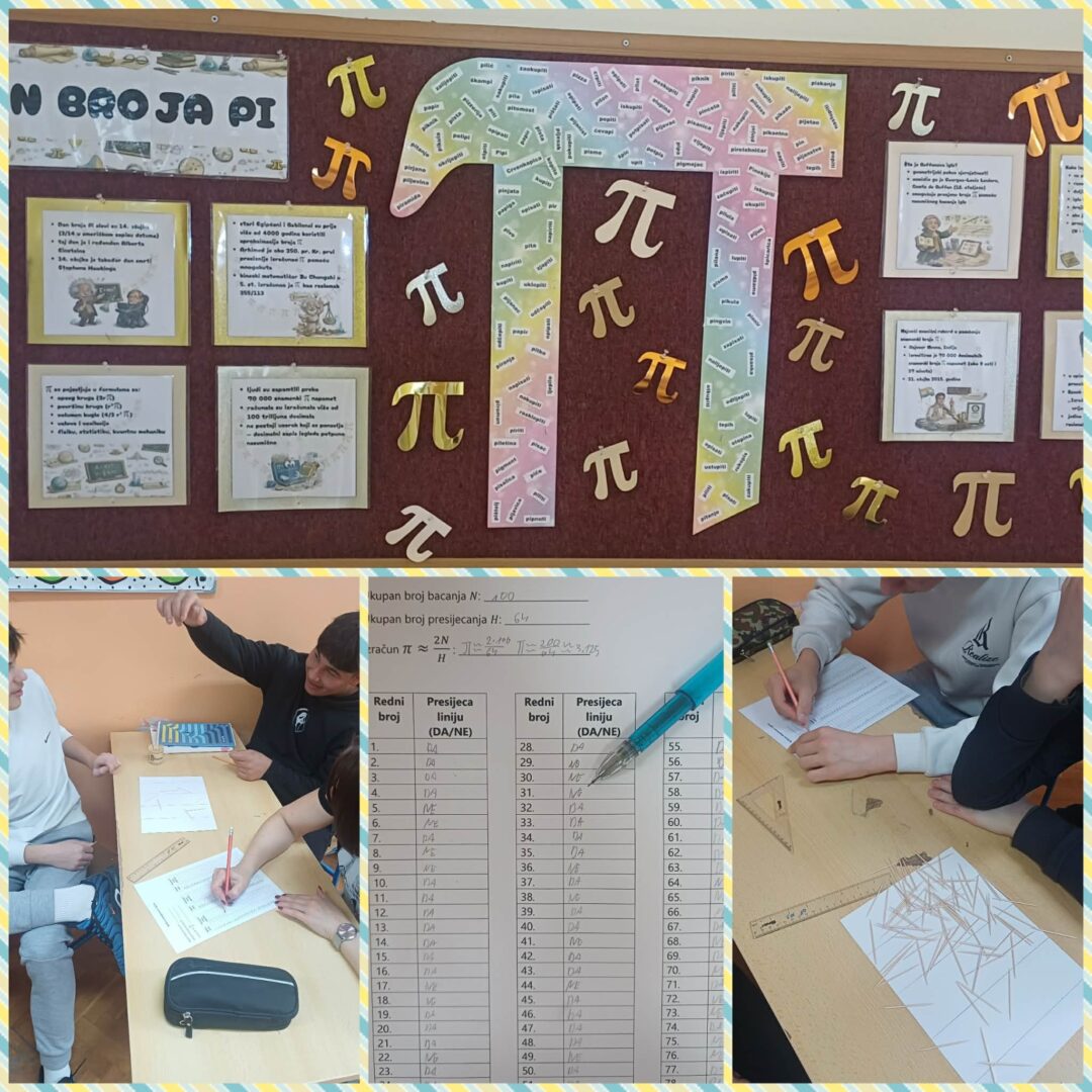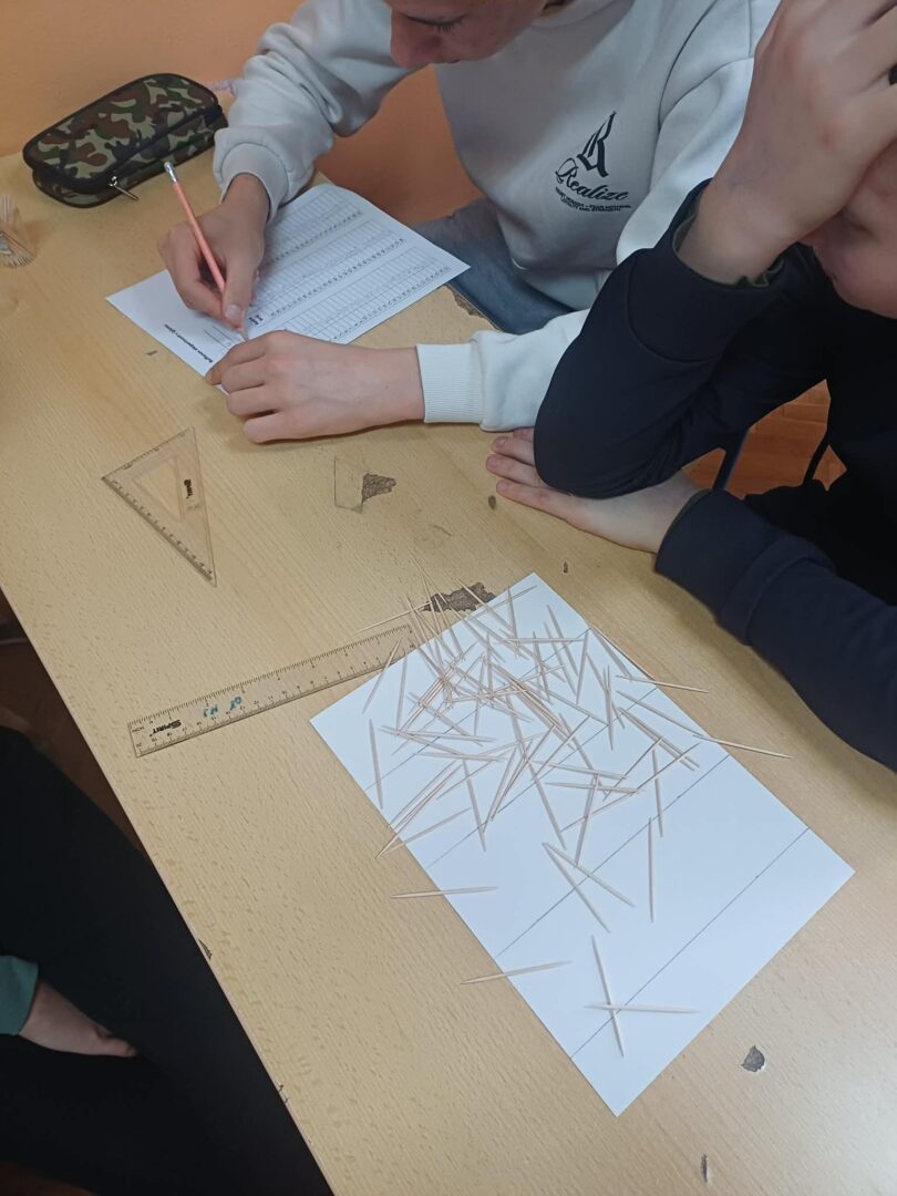 Posebnu pažnju privukao je Buffonov pokus s iglama, koji su učenici proveli na satu matematike. Umjesto igala koristili smo čačkalice koje su učenici nasumično bacali na papir s paralelnim linijama. U skupinama su pažljivo bilježili rezultate – broj presijecanja linija i ukupan broj bacanja. Na temelju prikupljenih podataka izračunali su približnu vrijednost broja π te uočili kako se s većim brojem pokušaja dobiveni rezultat sve više približava stvarnoj vrijednosti. Ovaj pokus učenicima je na zanimljiv i konkretan način približio povezanost matematike i slučajnosti.