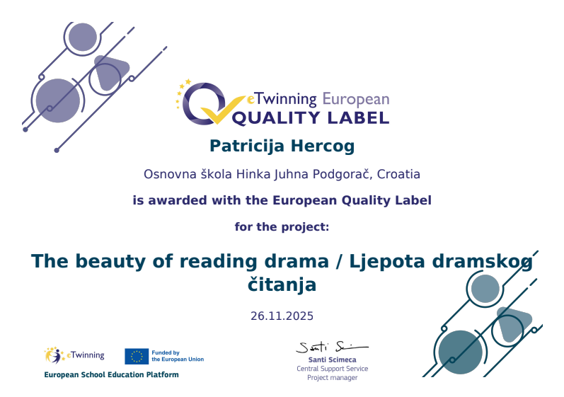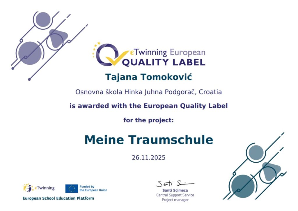 U našu školu krajem studenog stigle su Europske oznake kvalitete za izuzetno uspješno i kvalitetno provedene projekte. Radi se o dva međunarodna eTwinning projekta: Meine Traumschule i The beauty of reading drama. Projekti su provedeni u protekloj školskoj godini sa učenicima i učiteljima voditeljima aktivnosti (učiteljica Tajana Tomoković za projekt Meine Traumschule te učiteljice Patricija Hercog (s učenicima 4.r.PŠ Budimci) i učiteljica Martina Jantoš (s učenicima 4.r.PŠ Budimci i 5. a razredom za projekt The beauty of reading drama. Službeni jezici u projektima bili su engleski i njemački.