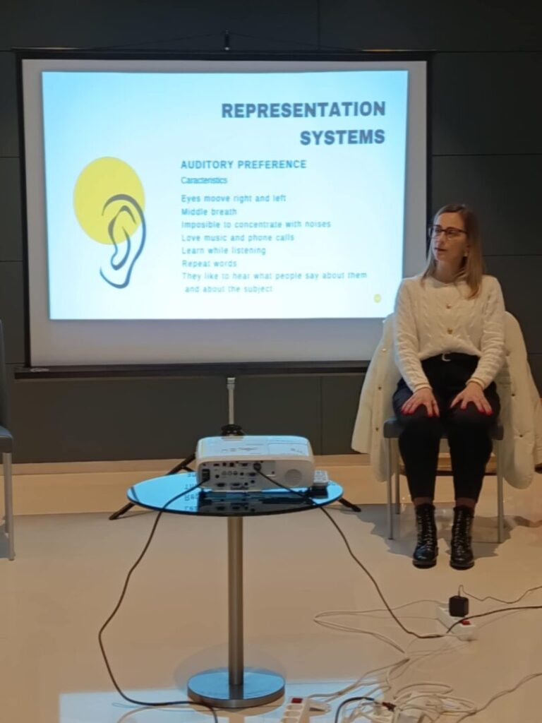 Tijekom petodnevnog intenzivnog programa učiteljice su se kroz predavanja, promišljanja, radionice i različite zadatke upoznale s EBER modelom koji pruža strukturirani okvir za razumijevanje emocionalnih procesa i načina reagiranja na njih. Kroz praktične vježbe obrađivane su teme uvjerenja i samosvijesti, s naglaskom na prepoznavanje unutarnjih obrazaca koji oblikuju ponašanje, odluke i komunikaciju. Posebna pažnja posvećena je reprezentacijskom sustavu, odnosno načinima na koje ljudi percipiraju, obrađuju i pohranjuju informacije, uključujući vizualne, auditivne, kinestetičke i digitalno-auditivne preferencije, što omogućuje prilagodbu komunikacije različitim učenicima i sugovornicima. Učiteljice su se također upoznale s metodama učinkovite komunikacije, uključujući tehniku „sandwich feedback“ za davanje povratne informacije koja kombinira pohvalu i konstruktivne sugestije za poboljšanje. Model neurolingvističkog programiranja pokazao se iznimno značajnim jer potiče dublje razumijevanje sugovornika, jača samokontrolu i samopouzdanje, povećava emocionalnu osviještenost te pridonosi donošenju promišljenih i odgovornih odluka.