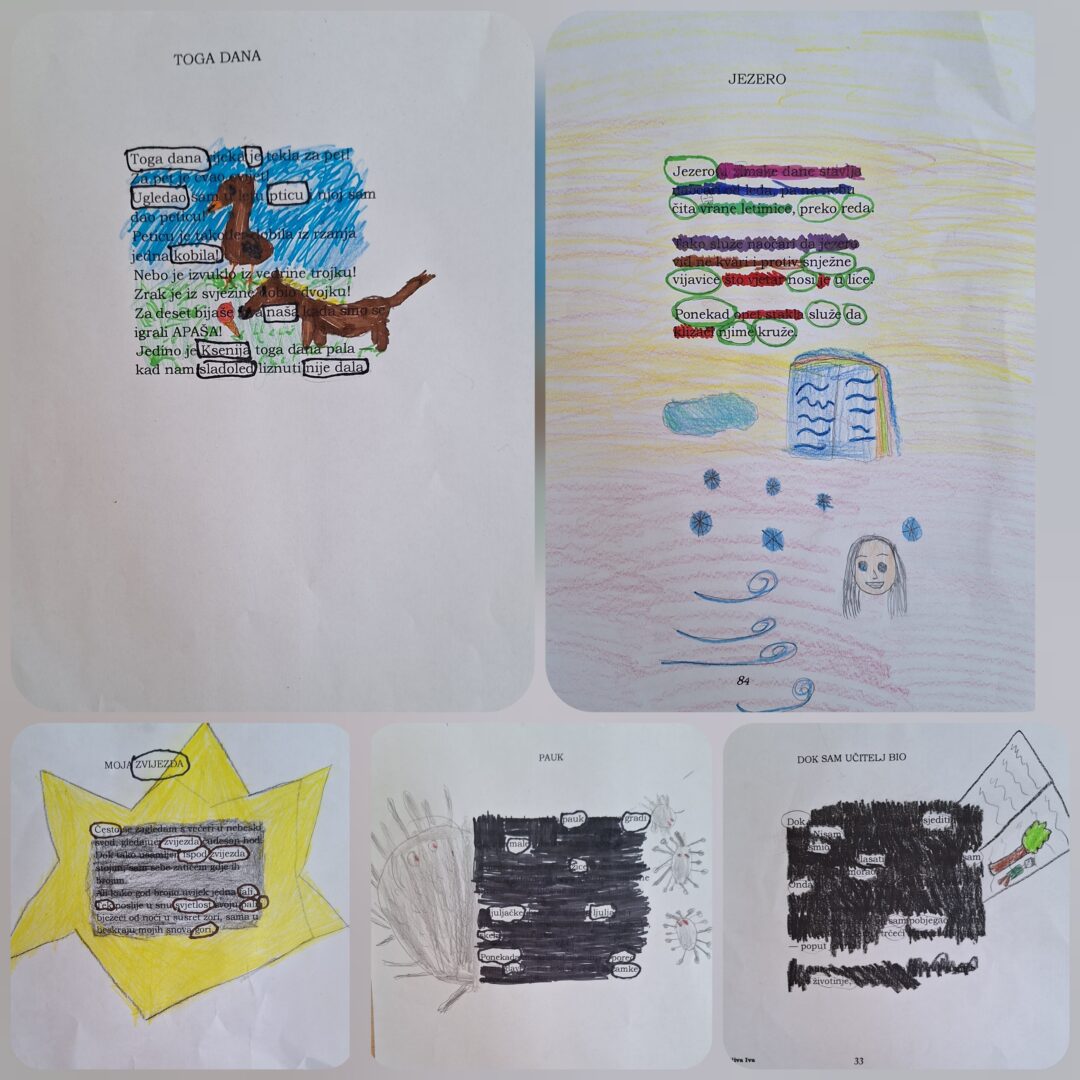 Nakon čitanja pjesama učenici su dobili pjesme na kojima će raditi blackout poeziju. Blackout poezija je tehnika u kojoj se na postojećem tekstu zacrnjuju određene riječi, ostavljajući samo one koje tvore novu pjesmu s drugačijim značenjem. Učenici su iz pjesama “Nevidljive Ive” birali riječi koje su ih inspirirale te su ih oblikovali u vlastite pjesničke uratke. Na taj su način stvarali jedinstvene literarne kompozicije koje su odražavale njihovu kreativnost i osobni doživljaj poezije.
