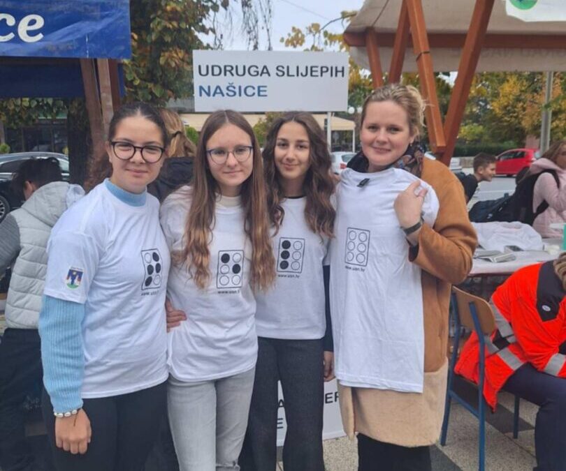 Međunarodni dan bijelog štapa započeo je sa svojim obilježavanjem 15.10.1964. godine. U središtu obilježavanja su slijepi ljudi, a bijeli štap predstavlja njihov simbol.  U Hrvatskoj je takvo obilježavanje započelo 1996.godine pridruženo s mnogim drugim zemljama. U našoj bližoj okolini djeluje Udruga slijepih Našice koji svojim djelovanjem olakšavaju život slijepim osobama. Tako je na glavnom gradskom trgu u Našicama 15.10. obilježen Međunarodni dan bijelog štapa s mnogim aktivnostima. Učenice naše škole koje su ove godine predstavile svoj rad o volontiranju na državnoj smotri iz Građanskog odgoja i obrazovanja u Zagrebu, zajedno sa svojom učiteljicom iz biologije, rado su sudjelovale u provedbi ovog javnog događaja. Na fotografijama možete vidjeti njihovo uključivanje u program.