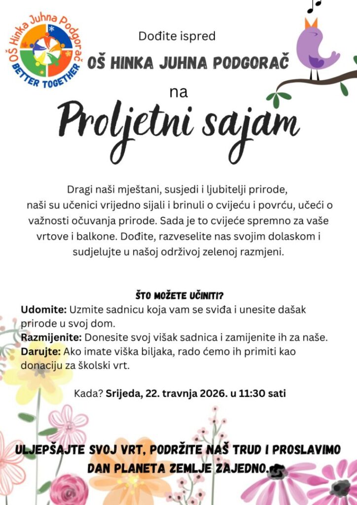 Dragi učenici, roditelji, mještani i prijatelji, u srijedu, 22. travnja 2026., proslavit ćemo Dan planeta Zemlje Proljetnim sajmom. Naše cvijeće i povrće koje su učenici sijali u ožujku, odlično napreduju. Želimo s vama podijeliti plod naših ruku pa vas pozivamo da posjetite naš mali sajam i uključite se na bilo koji način.