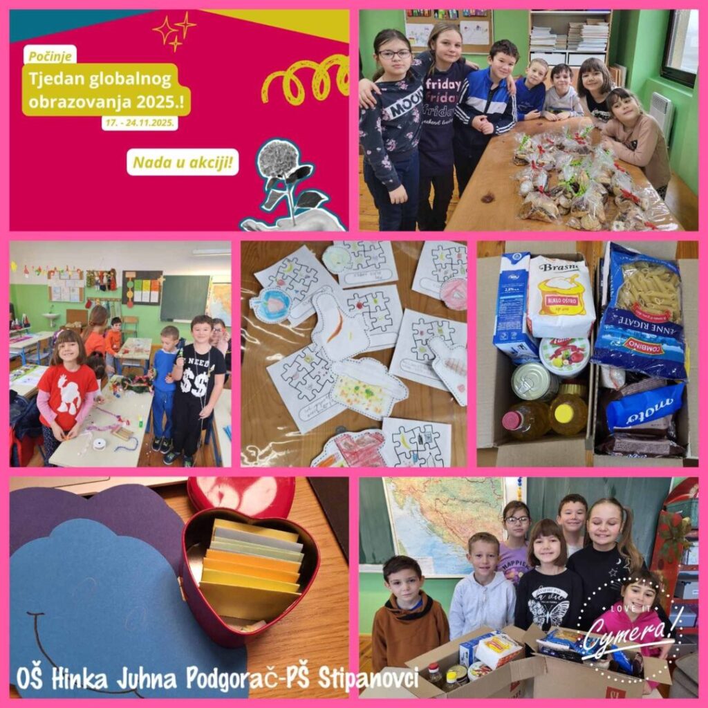 I ovog mjeseca studenog učenici PŠ Stipanovci uključili su se u Tjedan globalnog razvoja (Global Education Week) koji se održavao od 17. do 24. studenog 2025., s fokusom na obilježje “Nada u akciji – za pravednu, mirnu i održivu budućnost”. Tjedan globalnog obrazovanja međunarodna je inicijativa koju u Hrvatskoj koordinira Centar za mirovne studije, u suradnji s mrežom Centra Sjever-Jug Vijeća Europe. Cilj je potaknuti promišljanje o globalnim izazovima i zajedničku odgovornost za svijet u kojem živimo – svijet solidarnosti, jednakosti, održivosti i mira. Zadanim aktivnostima učenici naše škole nastojali su raditi na pozitivnim promjenama u ponašanju djece i mladih, razvijanju osjećaja pripadnosti zajednici, humanosti, solidarnosti i radu za opće dobro na korist cijele lokalne zajednice. Učenici su uz potporu svojih  roditelja prikupili namirnice te su pripremili ukusne slatke paketiće suhih kolačića koji će se donirati najpotrebitijima u predblagdansko vrijeme. Na ovaj način učenici su naučili kako je prihvaćanje i poštivanje različitosti i individualnih razlika kako u svakodnevnom životu, u školama i lokalnim zajednicama tako i općenito u cijelom svijetu jako važno te kako trebamo biti tolerantni i pomagati jedni drugima. Vrijedne ruke naših učenika pretvorili su nadu u konkretna djela te učinili obrazovanje pokretačem pozitivnih promjena.