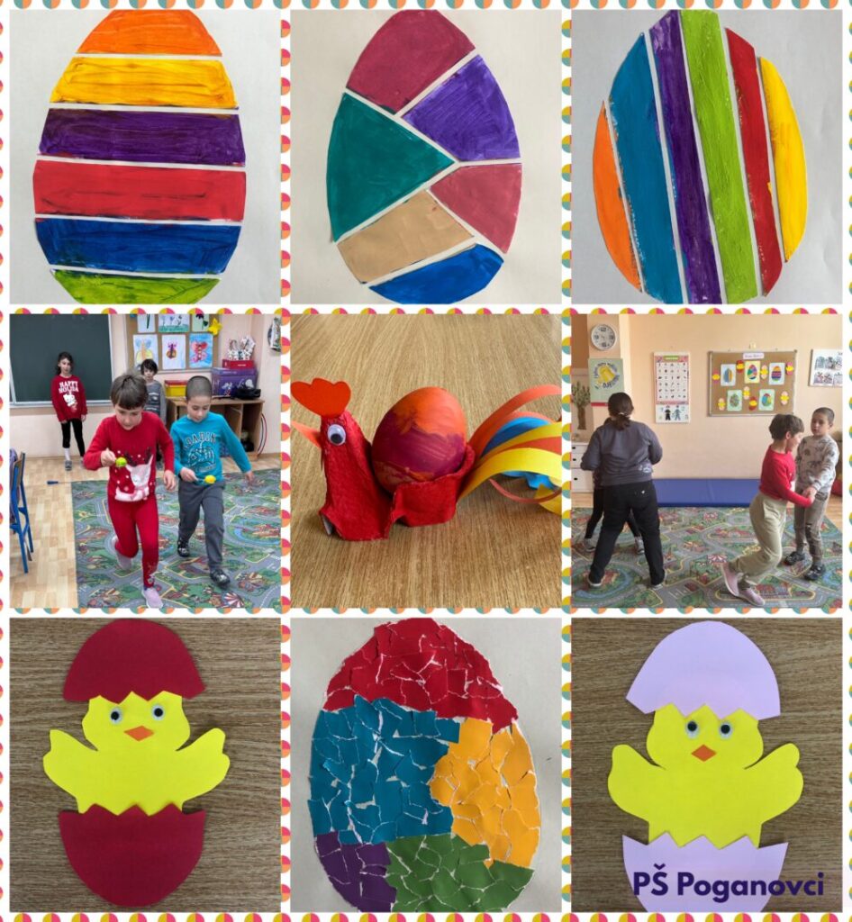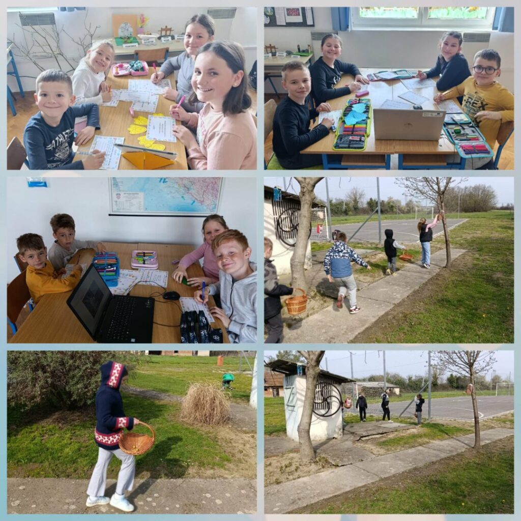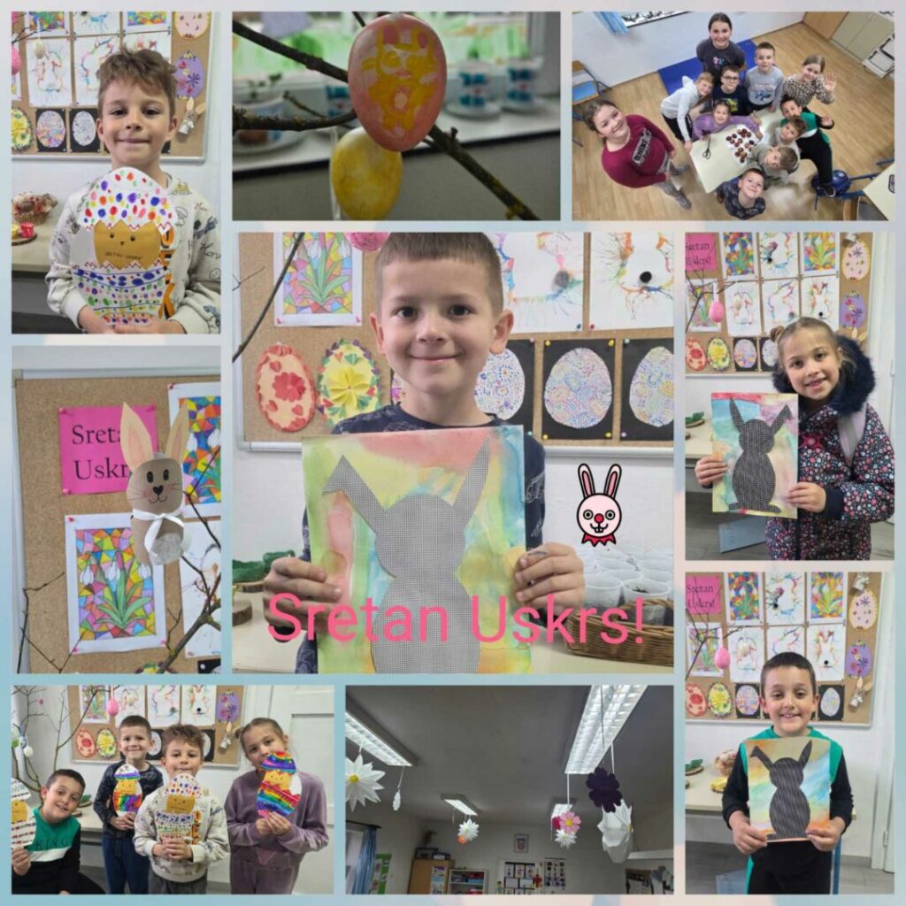 Već tradicionalno, potaknuti nadolazećim blagdanom i proljetnim raspoloženjem, tjedan dana prije Cvjetne nedjelje počeli smo s uređenjem učionice. Ukrasili smo pano, školske prozore i vrata, a tema Uskrsa prožimala je tih dana sve naše nastavne predmete. Cilj je bio razumijevanje blagdana Uskrsa i razvijanje zajedničkog doživljaja blagdana uz njegovanje pozitivnih odnosa prema tradiciji. Trudili smo se pokazati svu svoju maštu i kreativnost. Čitali smo i istraživali o Uskrsu, smišljali i izvodili igrokaze, plesali uz pjesmu Zeko pleše, izrađivali čestitke i pjetliće od kutijica za jaja, bojali pisanice… Posebno nas je razveselila štafetna igra prenošenja pisanica u žlicama, a kraj uskršnjih aktivnosti u našoj školi zasladila je potraga za čokoladnim jajima.