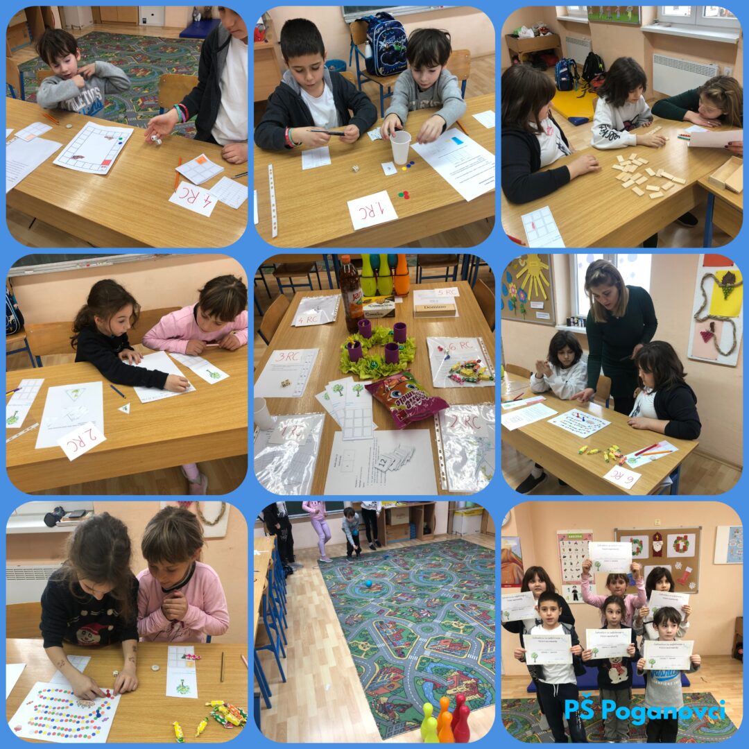 „I ove smo godine u našoj školi održali Večer matematike kako bismo potaknuli pozitivan stav učenika prema matematici. Večer matematike u Područnoj školi Poganovci obilježili smo 4. prosinca, a u zabavnim matematičkim aktivnostima sudjelovalo je ukupno 6 učenika 1., 3. i 4. razreda. Zadatak učenika bio je obići sve radne centre, koji su bili organizirani po brojevima u smjeru kazaljke na satu. Bilo je ukupno 9 radnih centara, 6 obveznih za sve učenike i 3 bonus centra, koje su odradili po želji oni učenici koji su brzo obišli sve obvezne centre. Prije nego su krenuli obilaziti centre, učenici su dobili putovnice koje su ih vodile od centra do centra. U svakom su centru pronašli upute i materijale pomoću kojih su odradili sljedeće aktivnosti: Zemlja bombona, Brojanje od zadanog broja, Računske priče, Prekriži sve, Utrka, Rimske brojke, Kuglanje, Dječji čičak pikado, Domino. Učenici su bili izrazito aktivni i oduševljeni pripremljenim matematičkim igrama. Uspješno su riješili postavljene zadatke te još jednom otkrili zabavnu stranu matematike. Za svaku pobjedu bili su nagrađeni bombonima, a na kraju su za svoju aktivnost i trud dobili zahvalnice.“
