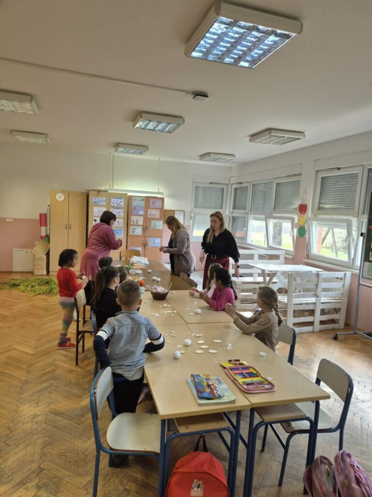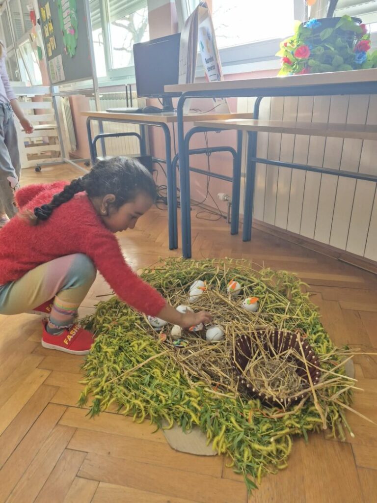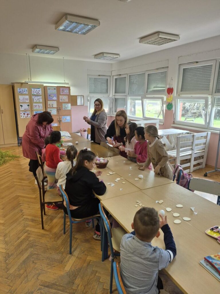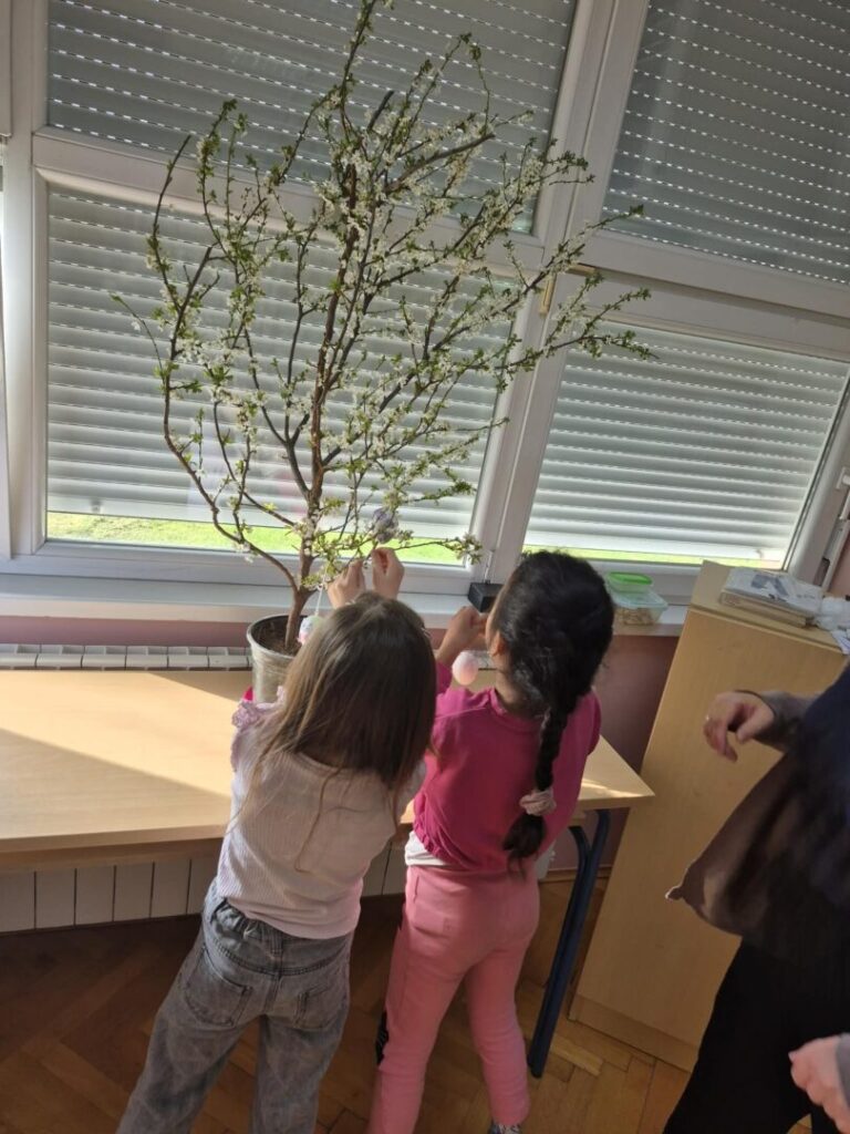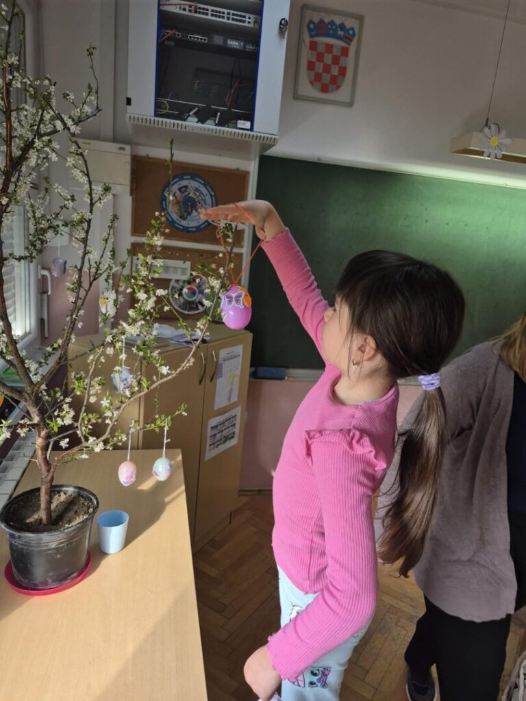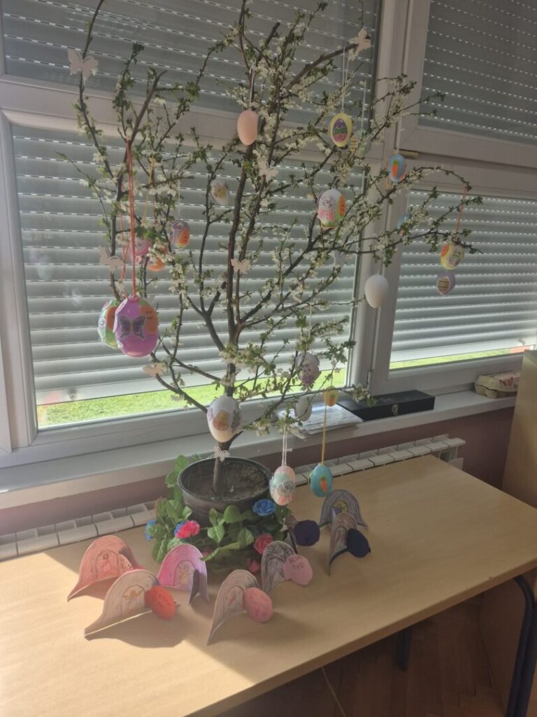 Dan je započeo razgovorom i olujom ideja o značenju najvećeg kršćanskog blagdana za svakog od nas. Razgovor je povela vjeroučiteljica Anita Firic a učenici su se nadovezivali svojim razmišljanjima i iskustvima iz vlastitih obitelji vezano za temu. Istraživali smo na razrednom računalu načine bojanja pisanica kroz povijest te prepričavali svoja iskustva iz obitelji. Učenici su bojili i izrezivali te oblikovali i lijepili dijelove kako bi na kraju dobili papirni model Isusovog groba (prema priči iz Biblije). Na satu Likovne kulture gđa Marošević vodila je učenike kroz niz kreativnih aktivnosti: ukrašavanje i bojanje pisanica, izradu gnijezda od šiba i slame, ukrašavanje razrednog stabla pisanicama.